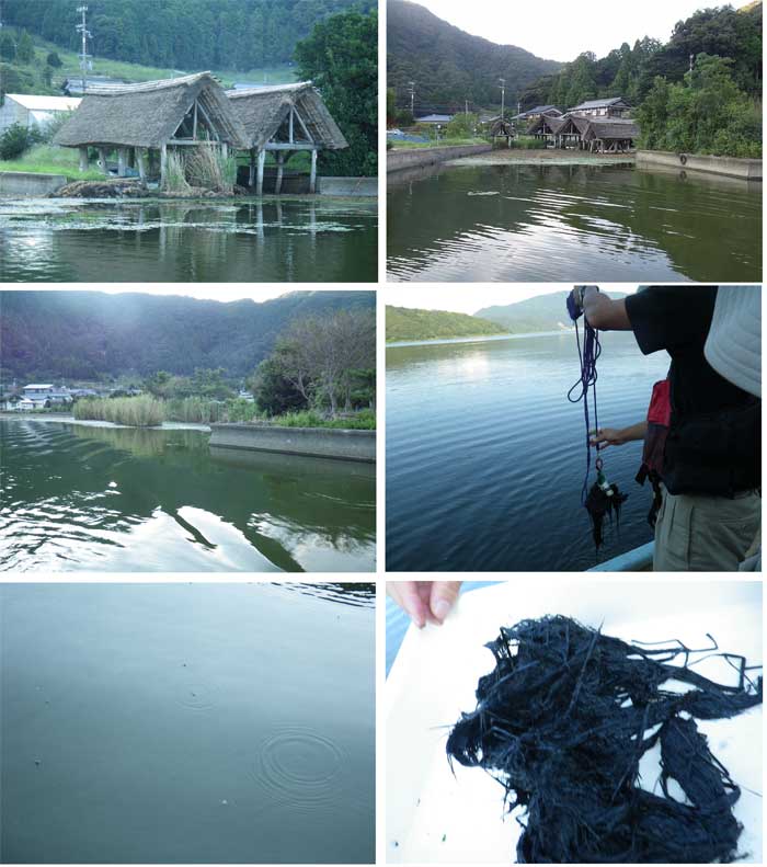 伊良積の舟小屋付近。生物調査はしていないが、湖底をさらったところ腐食したヒシの根が大量にとれた。ヒシの腐食による硫化水素臭がきつく、水面には湖底からあがってくる気泡が確認できた。水深は1.5mで、透明度は0.7mだった。