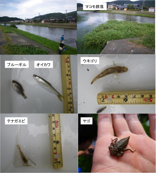ウキゴリ、ボラ(稚魚)、カワムツ、ブルーギル、テナガエビ、スジエビ、マルタニシ、カワニナ